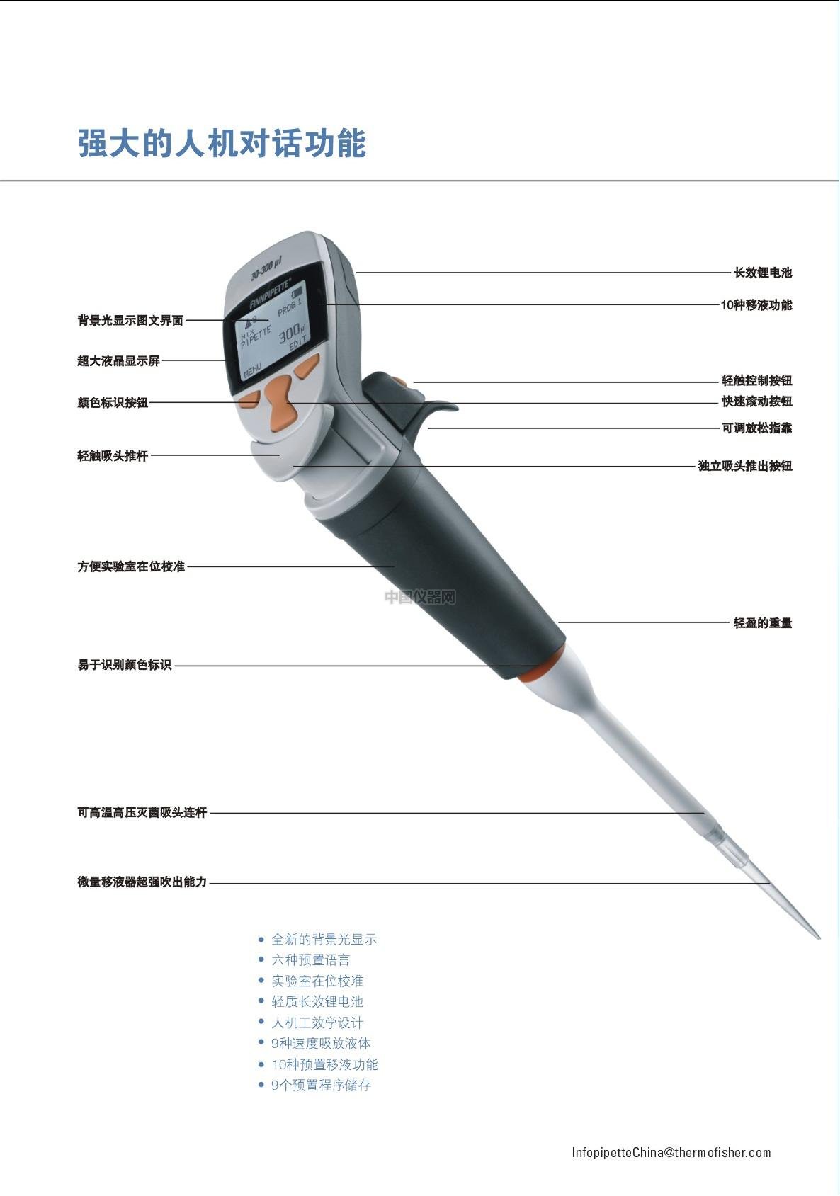 Finnpipette Novus是一支提供多種語言界面的電動移液器。提供包括英語、法語、意大利語、德語、西班牙語在內的六種語言界面的移液器。可以方便從“OPTAIN”菜單更換語言界面。新款提供全中文版本,特別適合中國用戶使用。