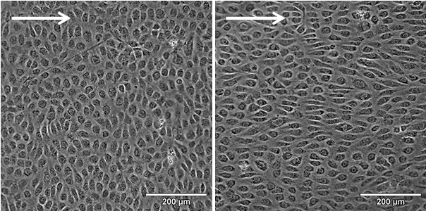 將HUVEC在I型膠原蛋白(2 mg / ml)上以10 dyn /cm2的流量分別培養2天(左)和5天(右)后,進行相差顯微鏡檢查 。