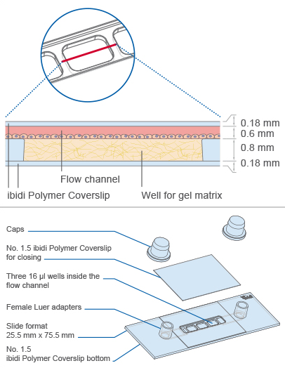 每個孔可以裝滿凝膠,孔內培養的細胞可用于顯微鏡研究。通道可以連接到泵(例如,ibidi流體泵系統),以施加定義的剪切力。