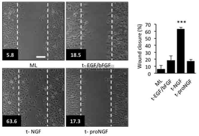 如圖所示,ML表示MCF-7 細胞系。腫瘤分離細胞團分別由EGF、bFGF、NGF和proNGF處理,由t-EGF/bFGF、t-NGF、t-proNGF表示。可以看到由NGF處理的細胞,在4h的時候覆蓋面積大,遷移速率快。