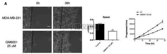 圖二:MDA-MB-231細胞侵襲過程受MMP調控。加入25μM的GM6001能顯著的減緩侵襲速率和侵襲面積。
