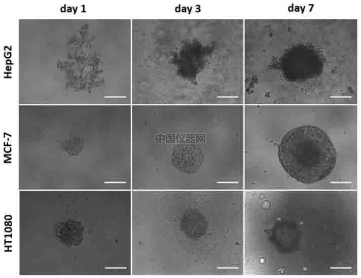圖一:不同細胞系的成團過程(每孔500個細胞),比例尺 200μm。